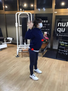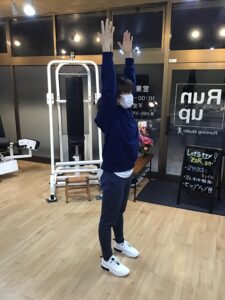 ①足を肩幅ほどまで広げ、両手を上げて手を向かい合わせます(できるだけ肘を伸ばしてください)