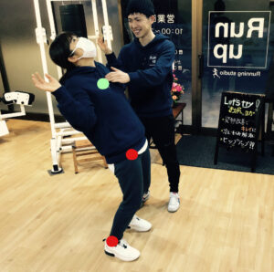 ④写真(右)のように、押されても立っていられたら、前に進む姿勢が整っています