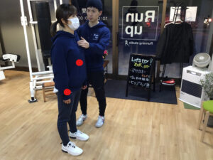 ②パートナーは横に立ち、相手の胸より少し上を軽く指で押します