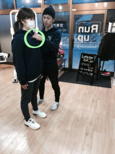 ②次に手のひらを外側に向けながら胸を開き、肘が肩より後ろへいくように下げていきます
